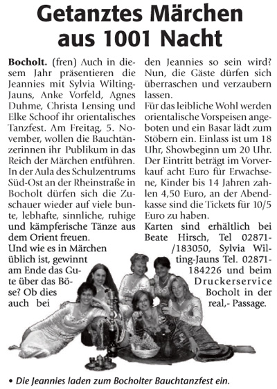 Zeitung Bocholter Report - Ihre Lokalzeitung für Bocholt, Rhede, Isselburg, Anholt, Hamminkeln, Dingden: "«Getanztes Märchen aus 1001 Nacht» - Bocholt: Auch in diesem Jahr präsentieren die Jeannies mit Sylvia Wilting-Jauns, Anke Vorfeld, Agnes Duhme, Christa Lensing und Elke Schoof ihr orientalisches Tanzfest. Am Freitag, 5. November, wollen die Bauchtänzerinnen ihr Publikum in das Reich der Märchen entführen. In der Aula des Schulzentrums Süd-Ost an der Rheinstraße in Bocholt dürfen sich die Zuschauer wieder auf viele bunte, lebhafte, sinnliche, ruhige und kämpferische Tänze aus dem Orient freuen..." - Pressebericht zur Bauchtanz Show auf dem 18. Bocholter Bauchtanzfest mit dem Ensemble "EL AMAL" mit den Bauchtänzerinnen Soraya, Thalia und Zina