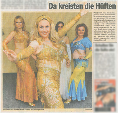 Zeitung Express Düsseldorf - Aktuelle Nachrichten aus der Region Köln, Düsseldorf und Bonn: "Da kreisten die Hüften - Düsseldorf: Was für ein Hingucker! Gestern trafen sich über 80 Bauchtänzerinnen aus NRW und Rheinland-Pfalz in einem einzigartigen Trainingskamp an der Erkrather Straße. Unter der Leitung der Düsseldorfer Bauchtänzerin Soraya (alias Sonja Teske) fand für die Damen, die allesamt reich verzierte Kostüme trugen, eine Generalprobe statt. Am 19. September treten sie beim "Ballonglühen" anlässlich des Moerser Ballonfestivals mit ihrer mitreißenden Show auf." - Pressebericht zur Generalprobe für das "9. Moerser Freiballon Festival 2009" - Bauchtanzshow mit 90 Bauchtänzerinnen unter der künstlerischen und organisatorischen Gesamtleitung von Bauchtänzerin Soraya mit Auftritt beim Ballonglühen bei der "ENNI Nacht der Ballone" des Festival-Hauptsponsors ENNI - Energie Wasser Niederrhein GmbH, Moers; Generalprobe mit freundlicher Unterstützung vom Fitnesscenter "City Fitness Düsseldorf", Düsseldorf