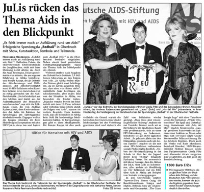 Aachener Nachrichten: "JuLis rücken das Thema Aids in den Blickpunkt - Es fehlt immer noch an Aufklärung rund um Aids! - Erfolgreiche Spendengala "Redball" in Oberbruch mit Show, Kunstauktion, Tombola und und Talkrunde"; Pressebericht zur Redball Spendengala 2007