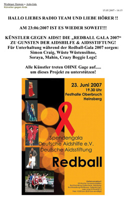Radiomusikalarm ... der etwas andere Sender im Web: "Künstler gegen Aids - Die Redball Gala 2007 zugunsten der Aidshilfe und Aidsstiftung"; Pressebericht zur Redball Spendengala 2007