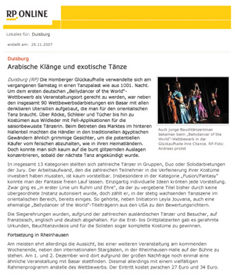 Rheinische Post - Lokales für Duisburg: "Arabische Klänge und exotische Tänze"; Pressemeldung zum "1st Bellydancer of the World Contest" / Weltmeisterschaft Bauchtanz in Duisburg - Auftritt mit dem Ensemble El Amal