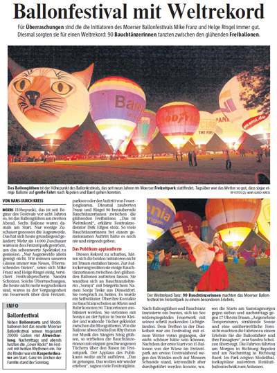 Zeitung Rheinische Post - Der Grafschafter [Moers, Kamp-Lintfort, Neukirchen-Vluyn, Rheurdt]: "Ballonfestival mit Weltrekord - Für Überraschungen sind die Initiatoren des Moerser Ballonfestivals Mike Franz und Helge Ringel immer gut. Diesmal sorgten sie für einen Weltrekord: 90 Bauchtänzerinnen tanzten zwischen den glühenden Freiballonen" - Pressebericht zur Bauchtanz-Show beim Ballonglühen auf dem 9. Moerser Freiballonfestival [Montgolfiade] mit 90 Bauchtänzerinnen unter der künstlerischen und organisatorischen Gesamtleitung von Bauchtänzerin Soraya