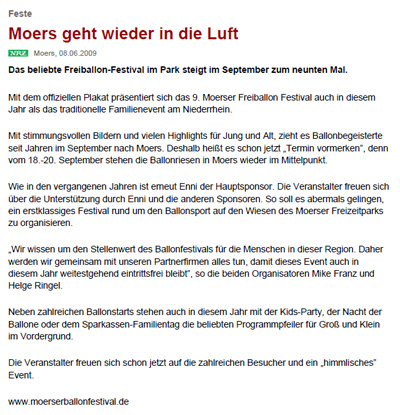 NRZ - Neue Ruhr Zeitung / Neue Rhein Zeitung [Essen]: "Moers geht wieder in die Luft - Das beliebte Freiballon-Festival im Park steigt im September zum neunten Mal." - Pressebericht zur Bauchtanz-Show beim Ballonglühen auf dem 9. Moerser Freiballonfestival [Montgolfiade] mit 90 Bauchtänzerinnen unter der künstlerischen und organisatorischen Gesamtleitung von Bauchtänzerin Soraya