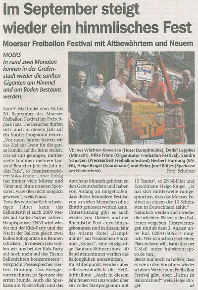 Zeitung LN Lokal-Nachrichten Moers [Homberg, Baerl, Rheinhausen, Rumeln-Kaldenhausen, Neukirchen-Vluyn, Kamp-Lintfort, Rheinberg / Orsoy]: "Im September steigt wieder ein himmlisches Fest - Moerser Freiballon Festival mit Altbewährtem und Neuem: In rund zwei Monaten können in der Grafenstadt wieder die sanften Giganten am Himmel und am Boden bestaunt werden." - Pressebericht zur Bauchtanz-Show beim Ballonglühen auf dem 9. Moerser Freiballonfestival [Montgolfiade] mit 90 Bauchtänzerinnen unter der künstlerischen und organisatorischen Gesamtleitung von Bauchtänzerin Soraya