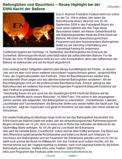 Niederrheinzeitung (Ihre Online Regionalzeitung aus Xanten): "Ballonglühen und Bauchtanz – Neues Highlight bei der ENNI-Nacht der Ballone: Das 9. Moerser Freiballon Festival steht nun schon vor der Tür. Wie in jedem Jahr laden die Ballonfreunde Moers diesmal vom 18.-20. September 2009 in den Freizeitpark Moers ein. Auch wenn natürlich alle drei Tage etwas Besonderes bieten, ein kleiner Geheimfavorit für alle Ballonbegeisterten bleibt die ENNI-Nacht der Ballone." - Pressebericht zur Bauchtanz-Show beim Ballonglühen auf dem 9. Moerser Freiballonfestival [Montgolfiade] mit 90 Bauchtänzerinnen unter der künstlerischen und organisatorischen Gesamtleitung von Bauchtänzerin Soraya