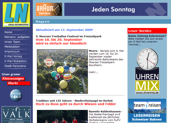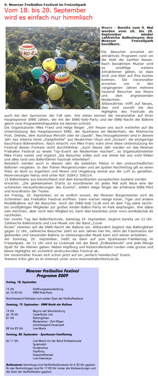 Zeitung LN Lokal-Nachrichten Moers [Homberg, Baerl, Rheinhausen, Rumeln-Kaldenhausen, Neukirchen-Vluyn, Kamp-Lintfort, Rheinberg / Orsoy]: "9. Moerser Freiballon Festival im Freizeitpark - Vom 18. bis 20. September wird es einfach nur himmlisch" - Pressebericht zur Bauchtanz-Show beim Ballonglühen auf dem 9. Moerser Freiballonfestival [Montgolfiade] mit 90 Bauchtänzerinnen unter der künstlerischen und organisatorischen Gesamtleitung von Bauchtänzerin Soraya