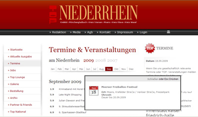 TOP MAGAZIN Niederrhein - regionales Lifestyle-Magazin auf gehobenem Niveau, Ausgabe Sommer 2009 [Gesellschaftsmagazin für Krefeld - Mönchengladbach - Kreis Viersen - Moers - Kempen - Kreis Kleve - Kreis Wesel]: "Termine & Veranstaltungen am Niederrhein, September 2009: Moerser Freiballon-Festival, 18. bis 20. September 2009" - Pressebericht zur Bauchtanz-Show beim Ballonglühen auf dem 9. Moerser Freiballonfestival [Montgolfiade] mit 90 Bauchtänzerinnen unter der künstlerischen und organisatorischen Gesamtleitung von Bauchtänzerin Soraya