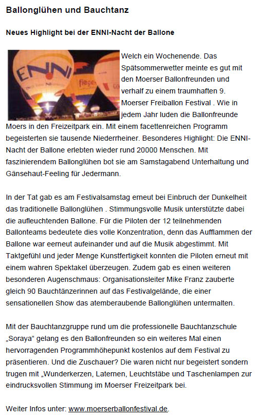 ENNI - Energie Wasser Niederrhein GmbH [Hauptsponsor der Moeser Freiballonfestivals]: "Ballonglühen und Bauchtanz - Neues Highlight bei der ENNI-Nacht der Ballone: Welch ein Wochenende. Das Spätsommerwetter meinte es gut mit den Moerser Ballonfreunden und verhalf zu einem traumhaften 9. Moerser Freiballon Festival. Wie in jedem Jahr luden die Ballonfreunde Moers in den Freizeitpark ein. Mit einem facettenreichen Programm begeisterten sie tausende Niederrheiner. Besonderes Highlight: Die ENNI-Nacht der Ballone erlebten wieder rund 20.000 Menschen. Mit faszinierendem Ballonglühen bot sie am Samstagabend Unterhaltung und Gänsehaut-Feeling für Jedermann." - Pressebericht zur Bauchtanz-Show beim Ballonglühen auf dem 9. Moerser Freiballonfestival [Montgolfiade] mit 90 Bauchtänzerinnen unter der künstlerischen und organisatorischen Gesamtleitung von Bauchtänzerin Soraya