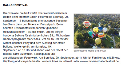 NRZ - Neue Ruhr Zeitung / Neue Rhein Zeitung [Essen]: "Der Terminkalender für den Niederrhein: In Krefeld geht's über den Laufsteg, in Bocholt werden Mörder gesucht, und in Kamp-Lintfort wütet der Wellness-Wahn. Ein spannendes Wochenende erwartet die Region: Ballonfestival Moers - Grenzenlose Freiheit wartet über niederrheinischem Boden beim Moerser Ballon-Festival bis Sonntag, 20. September. 15 Ballonteams und tausende Besucher bevölkern dann den Moerser Freizeitpark. Beim neunten Freiballonfestival „tanzen” glühende Heißluftballone im Takt der Musik, und es sorgen hunderte Ballone für ein farbenfrohes Bild..." - Pressebericht zur Bauchtanz-Show beim Ballonglühen auf dem 9. Moerser Freiballonfestival [Montgolfiade] mit 90 Bauchtänzerinnen unter der künstlerischen und organisatorischen Gesamtleitung von Bauchtänzerin Soraya