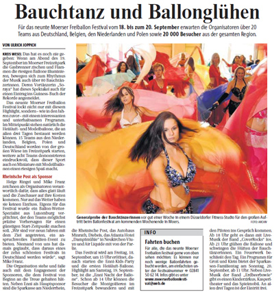 Zeitung Rheinische Post - Kreis Wesel Regional: "Bauchtanz und Ballonglühen - Für das neunte Moerser Freiballon Festival vom 18. bis zum 20. September erwarten die Organisatoren über 20 Teams aus Deutschland, Belgien, den Niederlanden und Polen sowie 20.000 Besucher aus der gesamten Region: KREIS WESEL - Das hat es noch nie gegeben: Wenn am Abend des 19. September im Moerser Freizeitpark die Gasbrenner zischen und Flammen die riesigen Ballone illuminieren, bewegen sich zum Rhythmus der Musik auch über 80 Bauchtänzerinnen. Deren Vortänzerin "Soraya" hat dieses Spektakel auch für einen Eintrag ins Guiness-Buch der Rekorde angemeldet." - Pressebericht zur Bauchtanz-Show beim Ballonglühen auf dem 9. Moerser Freiballonfestival [Montgolfiade] mit 90 Bauchtänzerinnen unter der künstlerischen und organisatorischen Gesamtleitung von Bauchtänzerin Soraya